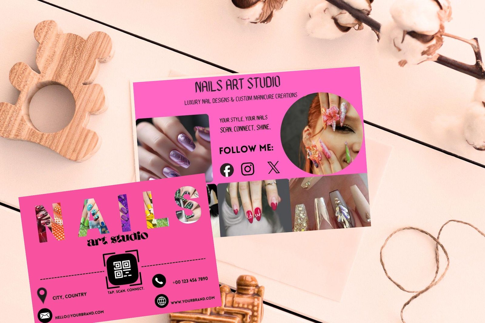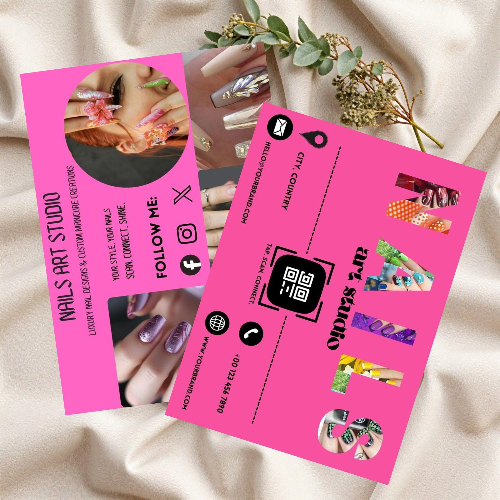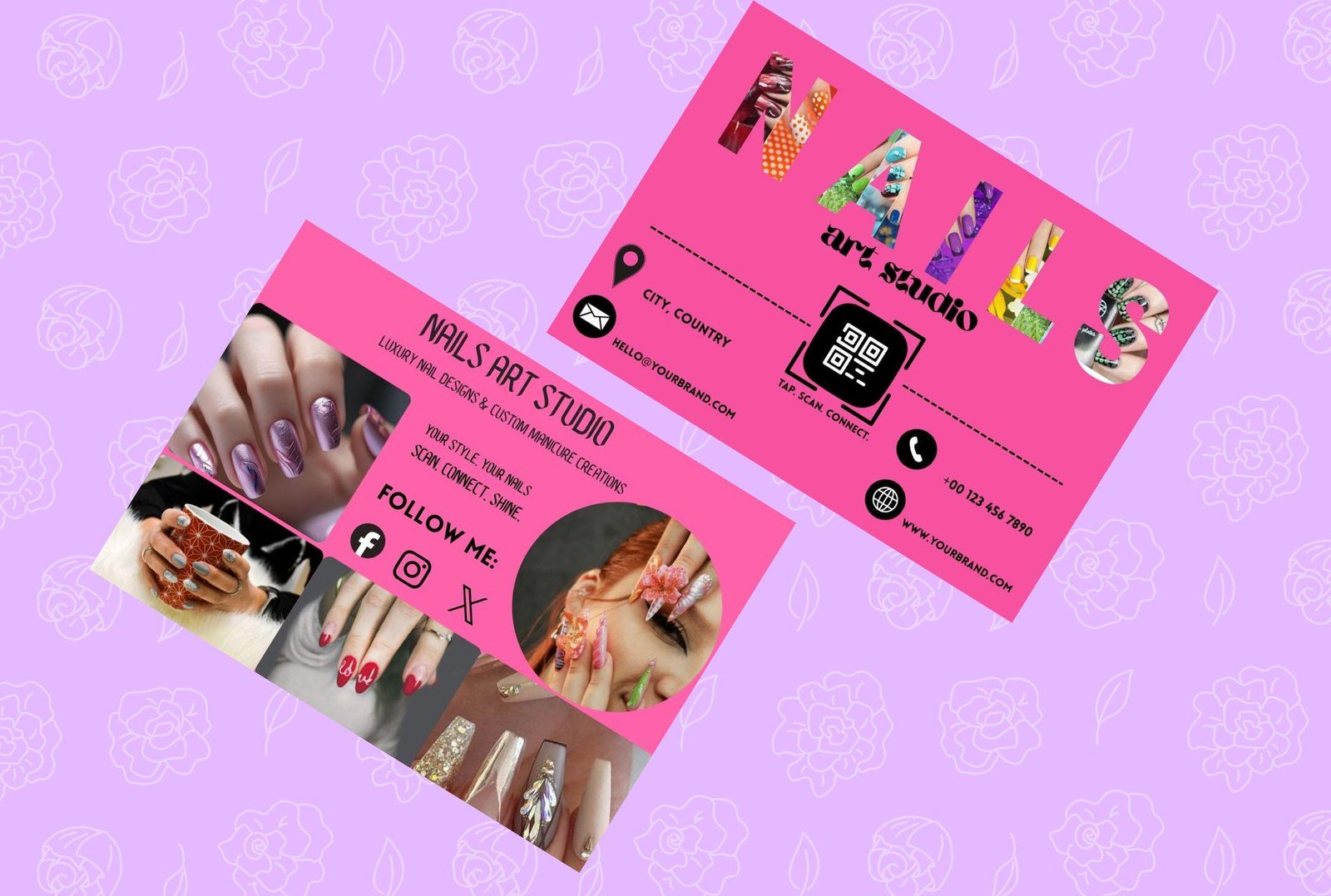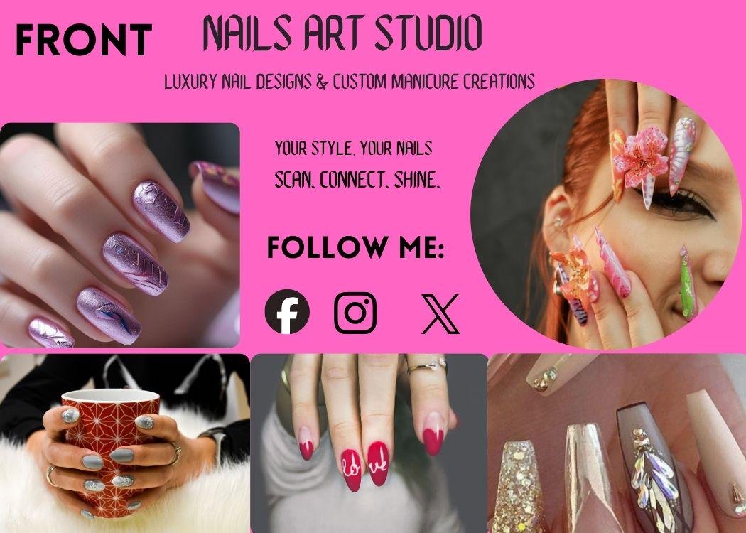 Stand out with this Editable WhatsApp QR Code Card Template — perfect for nail artists, beauty salons, and manicure professionals. This digital download business card lets you showcase your nail art services in a stylish and modern way.