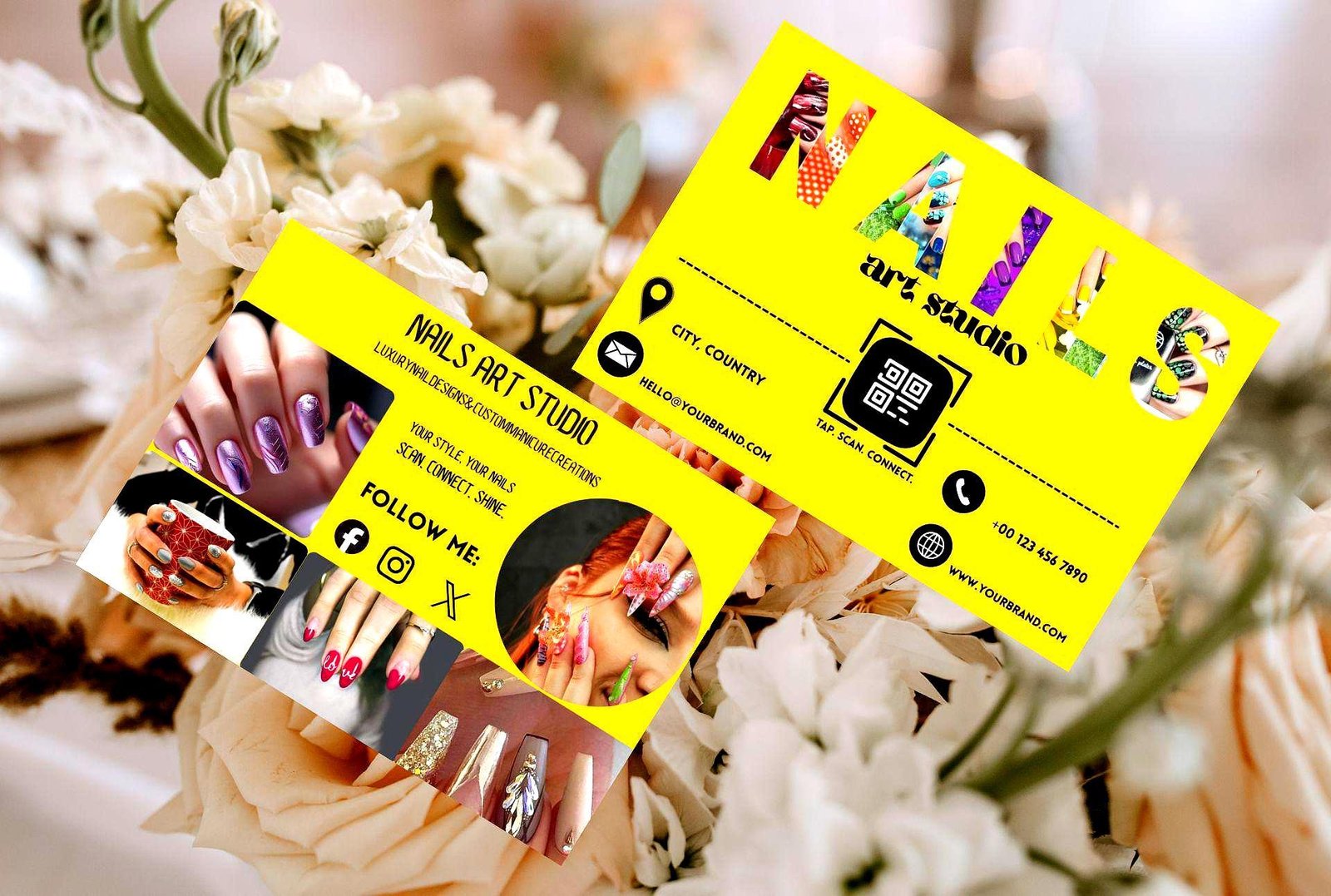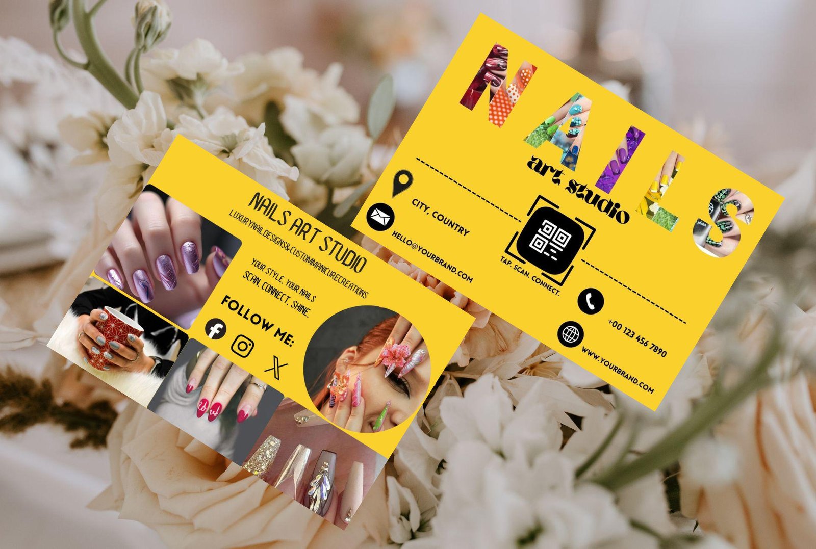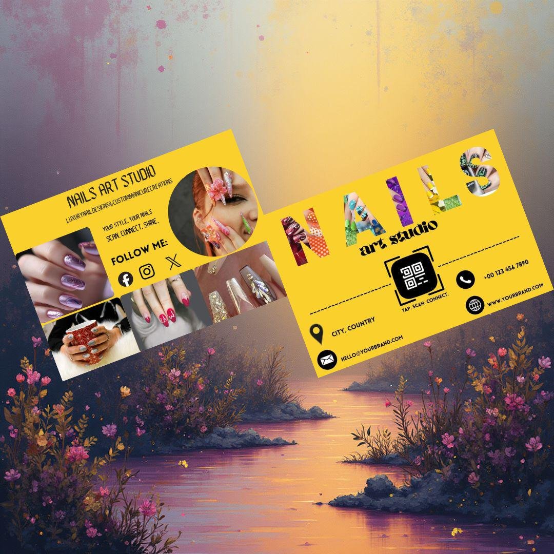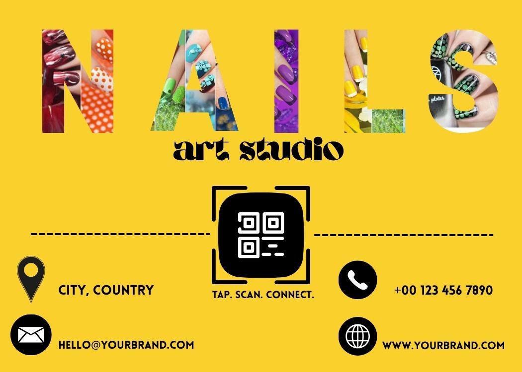 Designed in Canva, this editable salon card template features a vibrant yellow design, creative nail visuals, and a QR code for direct WhatsApp connection. Perfect for promoting your nail studio, sharing on social media, or printing for clients.
