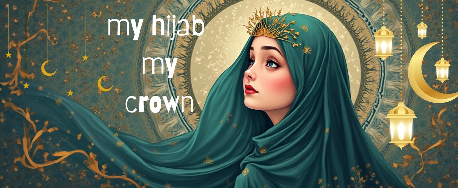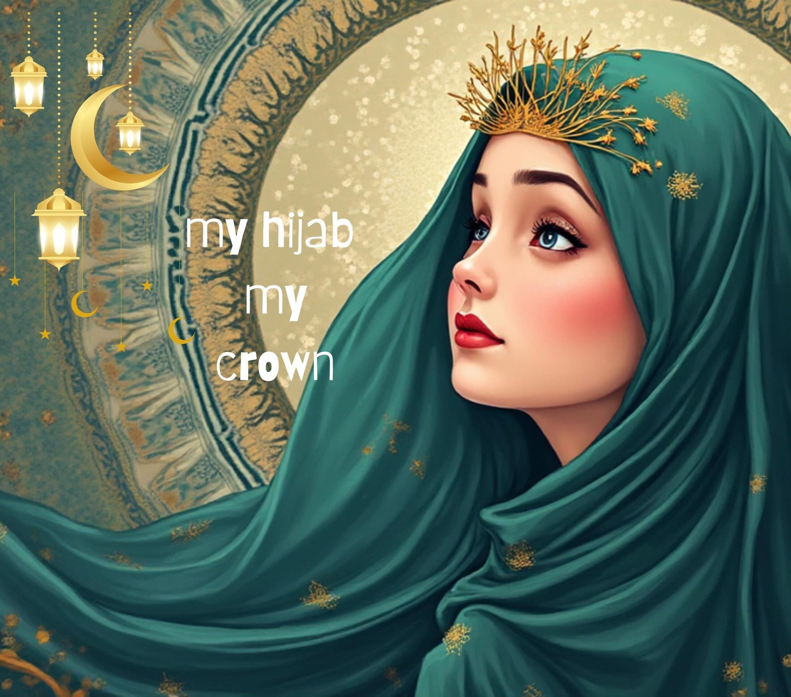 Theme: Modern Islamic art, celebrating the Muslimah identity with a regal, empowering message.